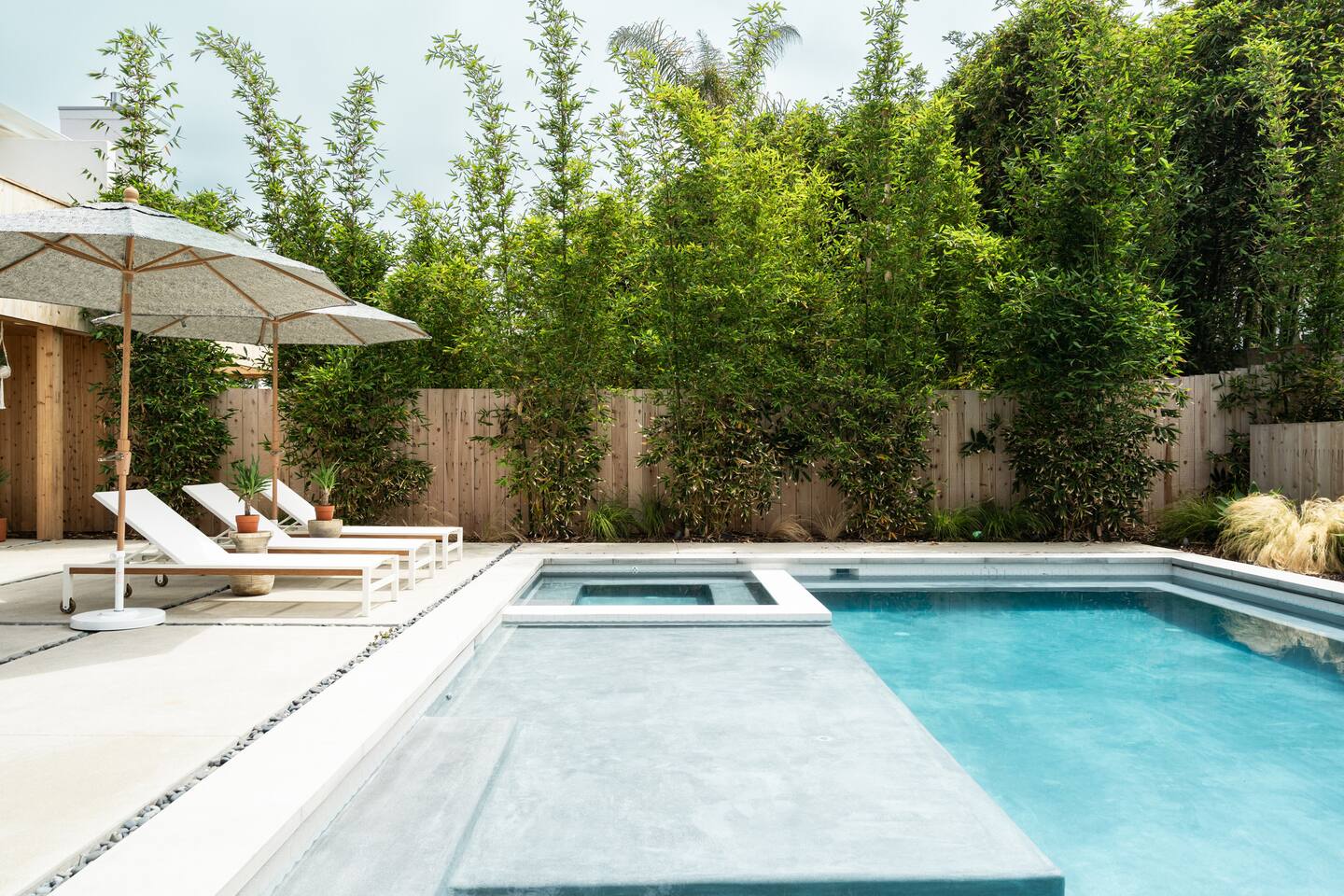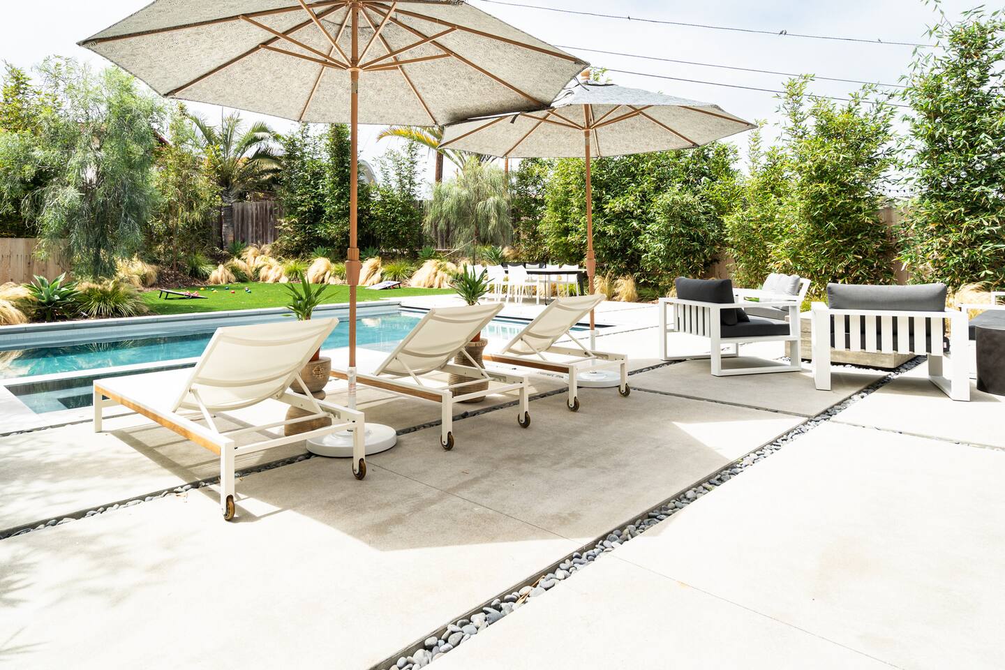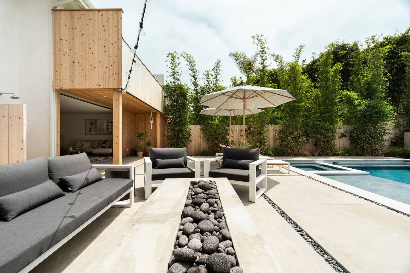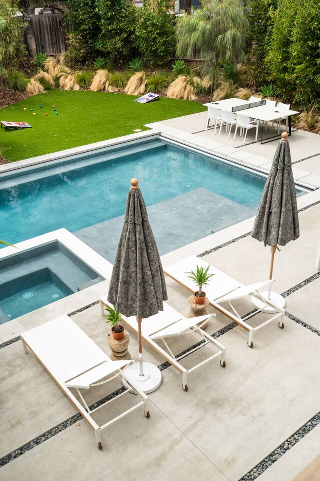 This is a peaceful neighborhood—perfect for families or a relaxing couples’ getaway. The backyard feels like your own private resort, featuring a large pool and spa surrounded by comfortable lounging areas. Tall bamboo lines the yard, creating a serene and very private setting. The home itself offers 3 bedrooms and 2.5 bathrooms. The primary bedroom features an Eastern king bed, the second bedroom has a California king, and the third bedroom includes a queen bunk with an XL twin on top—great for kids or additional guests. After a day at the nearby beach or relaxing by the pool, unwind in the living room with the cozy fireplace and a large 85" TV.